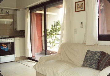 When you enter the building you’ll find a Feng Shui wall cascade, that represents the peace of the neighborhood. It’s a 40mts² Studio with a nice balcony giving plenty of natural light, once in the apartment you’ll find everything you need for a pleasent stay. Such as a fully equipped kitchen, as also the bathroom with a nice bathtub. For 2 guests, has a flat screen TV, cable, DVD, audio CD, microwave, coffee maker, toaster, full crockery,A/C cold/heat, linens, weekly maid service. The bedroom area has a queen bed and a big dressing room. The dinning area has a tablebar, long-chairs and the living room a comfortable sofa.